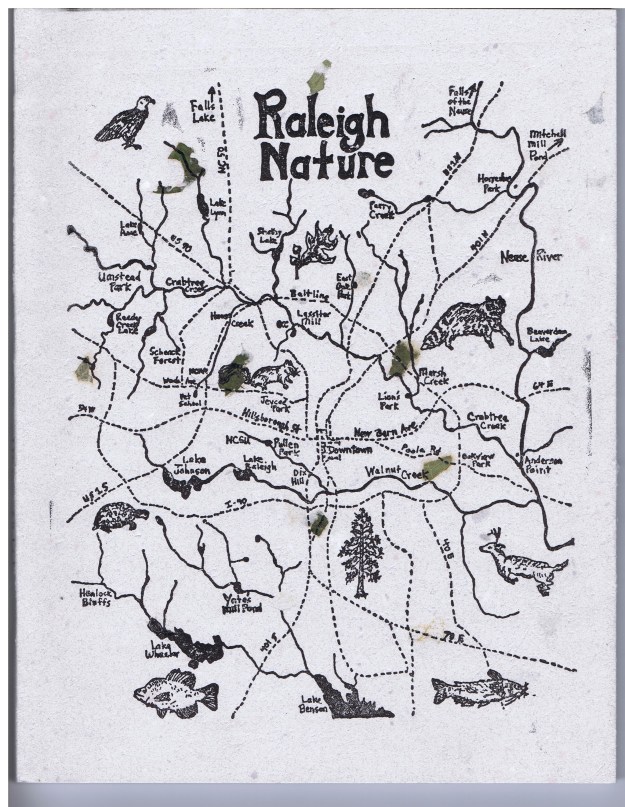 I am so proud to share that the book I have been working on for over a decade, for which I started this blog, is in print at last. Published by my own press The Paper Plant, it is an 80 page book with 16 chapters and 30 illustrations that captures the best of what i have learned and seen concerning Raleigh NC’s wonderful greenway system, parks, and other natural areas. This blog has been crucial in developing the book, and several features relate directly to the blog, especially the fantastic comments on Lassiter Mill and it’s history posted on the blog. Thanks to all my Raleigh Nature readers and I hope you obtain and enjoy the book.