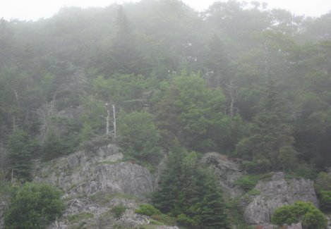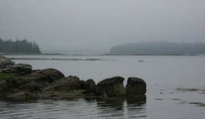 We experienced terrain much like he describes on our visit to the Blagden Nature Preserve at Indian Point, pictured above.  The Nature Conservancy holds a strip of land that stretches past private properties down to Indian Point, an outcrop jutting into the Western bay that is home to the largest population of harbor seals north of Boston.  We went at high tide and couldn’t see the seals, but we could hear their grunting and jostling through the foggy bay waters.
