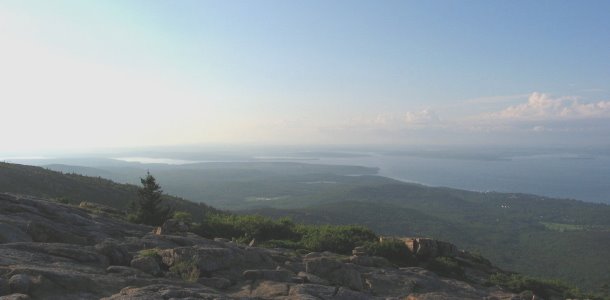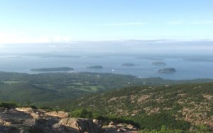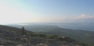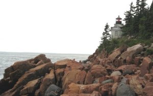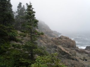 We did use our car to travel to the top of Cadillac Mountain, the highest point on the huge, glacier-scraped slab of granite that is Mount Desert Island.  We caught a brief respite in the cloudy mists that enveloped us much of the week and were able to see upper Frenchman’s Bay, the location of our cottage, the town of Bar Harbor and it’s namesake island, whose sandbar constitutes an extension of Bridge Street, accessible on foot or by vehicle during low tides, and Otter Point, whose cliffs make the beautiful scene photographed by Cara below.