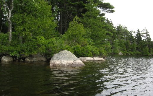 Mount Desert Island is a remnant of mountains that may have been as tall as the Alps, extending 80 miles beyond the current coastline.  The shore is built of granite and metamorphic materials carved and deposited by glaciers up to a mile thick.  The numerous bodies of freshwater are all long, narrow and aligned with the path of the glacier.  We canoed on Long Pond, one of these, and took the pictures below.