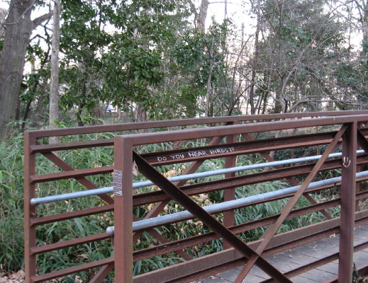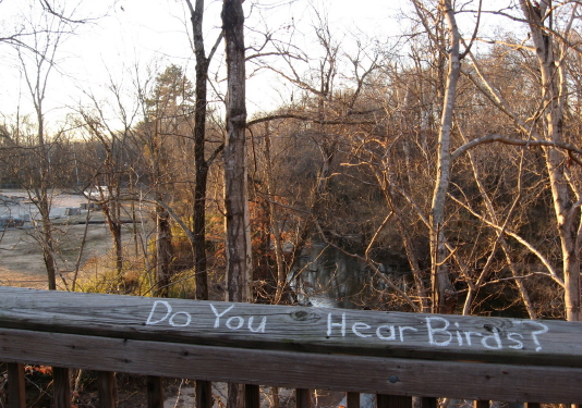 Julie’s installation consists of a poster about her piece inviting people to chalk “Do You Hear Birds?” in places they heard them, with a large pile of beautifully printed and wrapped chalks for people to pick up. Her blog documents responses. The piece is part of a show called “Local Histories.” Saturday, March 5, Julie is conducting a bird walk in association with her installation.