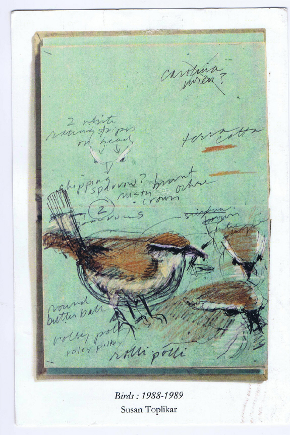 I also have to add this lovely image from an older bird show – Susan Toplikar’s show in 2008, based on notebooks of bird sketches she created while medically homebound. Birds have a presence that enters our lives: we take them for granted and yet we do observe and react to them, and they frame the audial background of our day in ways we hardly realize. Do you hear birds?