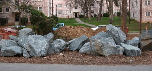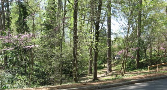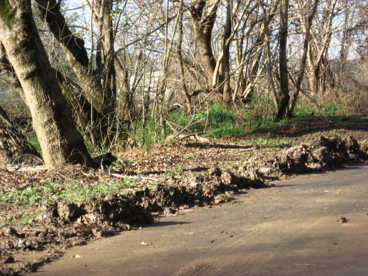 The beavers have indeed made great use of the spot with several different lodges in different spots. New generations of beavers tend to build their own lodge. Until I got the info from Mark, I assumed the construction of the road bed dammed up the water. The water on the east side of Raleigh Boulevard acts more normally – rising and falling with rains and seasons. I know the beavers play over there as well, because you can see their slides into Crabtree Creek as you walk down Buckeye toward Rollingwood.