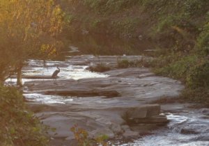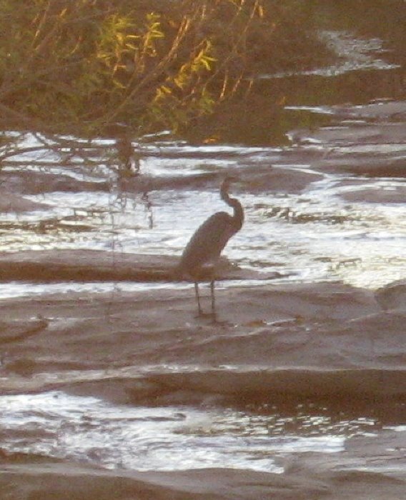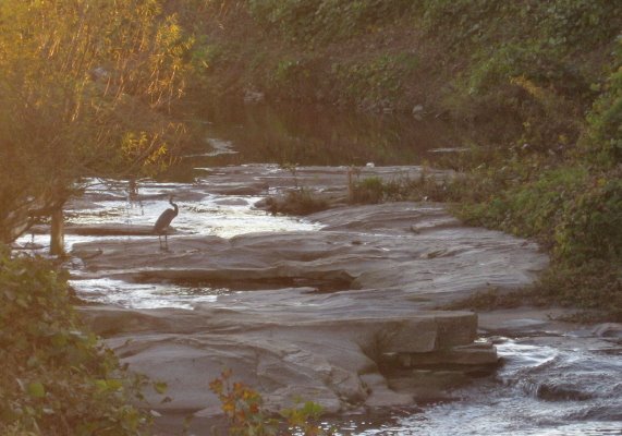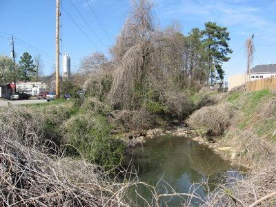 The site can be seen by walking a short way down the new sewer cut off of Crabtree Boulevard. After crossing a nifty and temporary metal bridge over Pigeon House Branch, just before it reaches Crabtree, Crabtree Creek is on your right and the small marsh is on the left. It makes me think of gator country for very small gators, though the “gators” that startle one here are furry and have criss-crossed tails.