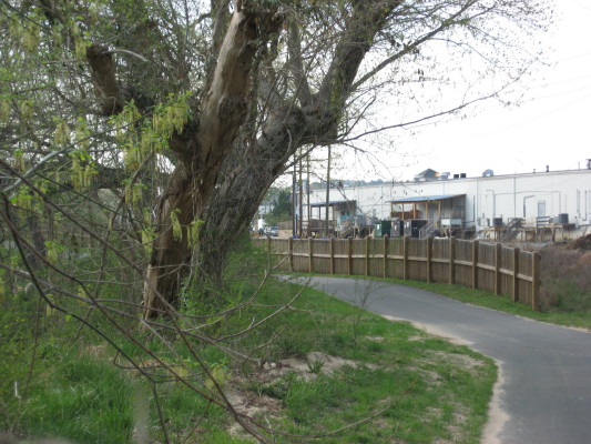 Six Forks dead ends right into Crabtree Creek on the south, and dead-ends right into Fall Lake northward. Along the way it takes you from Crabtree’s muddiest, most ditch-like stretch to a state park.  Above is the best spot on the tour – an upper tributary of Shelley lake just off Six Forks at the northern top of the greenway (aside from 2 isolated sections at Lake Lynn and Durant Park).  Below is a fairly ironic juxtaposition (a theme of this blog) – the back of the Longbranch saloon, edged by the greenway.