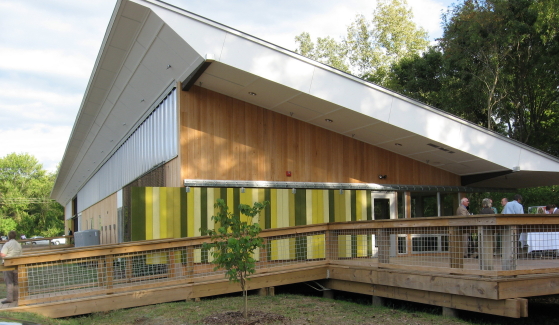 Musicians entertained on the “longest back porch in the Southeast,” and Erin Sterling, architect of record for the project from Frank Harmon Architecture, explained the details of the green design. The building is 230 feet long and narrow so that all rooms get light from two sides and often three. It is sloped up to the north and shelters its southern exposure with the long low porch roof. Raleigh’s final budget did not allow for the planned rainwater cisterns, but they can come later and the gutters now direct into bioretention areas – long rain gardens that surround the space. The building is on stilts and allows natural water flow under it – important in this floodplain. Recycled lumber and building materials were used when possible, and native plantings surround the site.